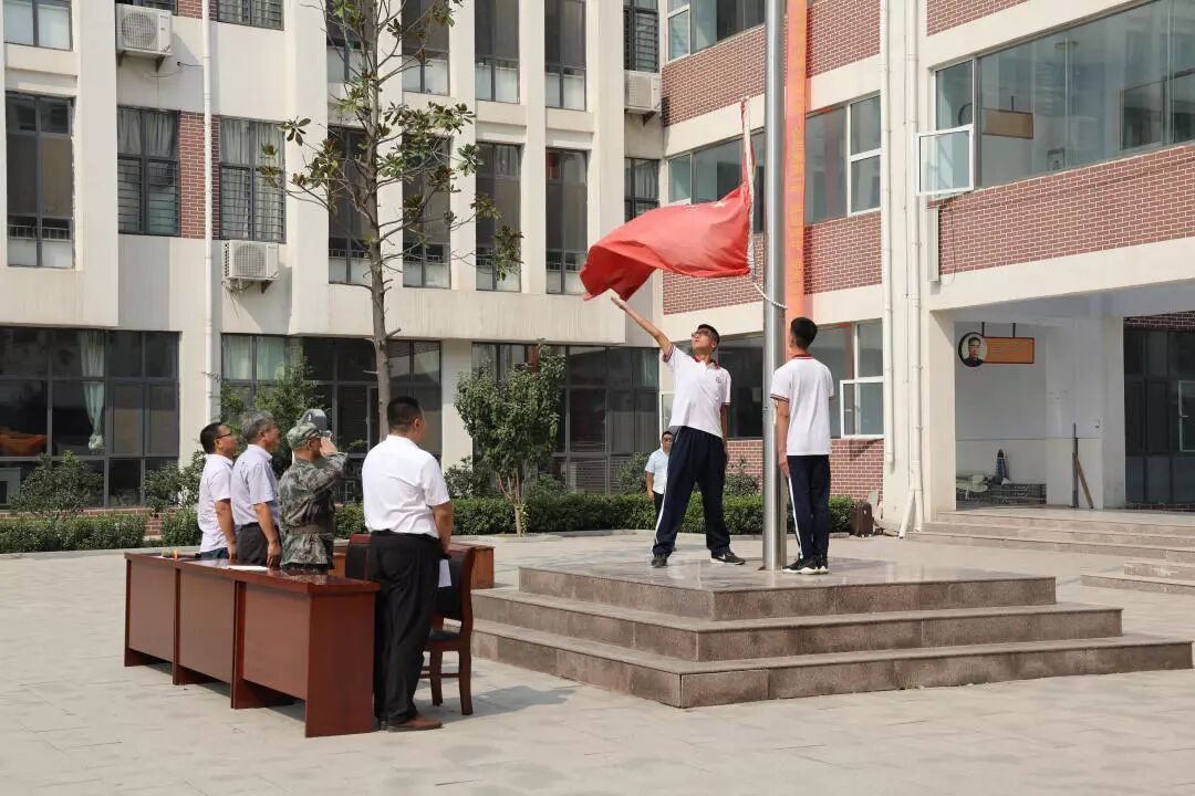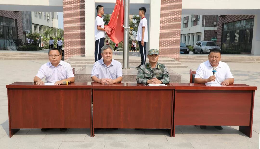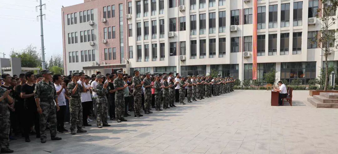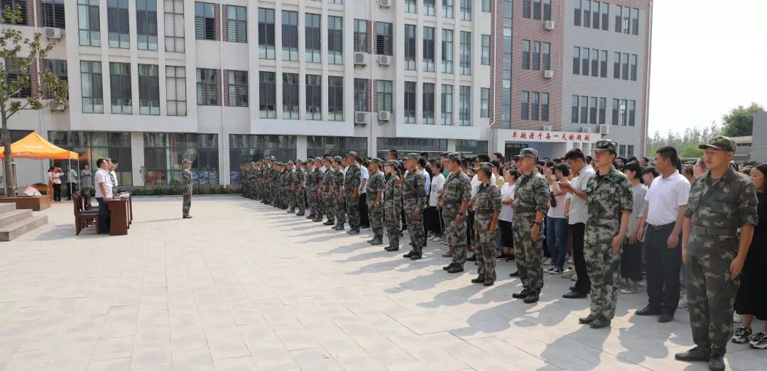 济南市新起点高中郑校长、邹校长、莱钢集团文化服务中心慕丰瑜同志、军训教官、各班班主任及高一全体新生参加了开营仪式。